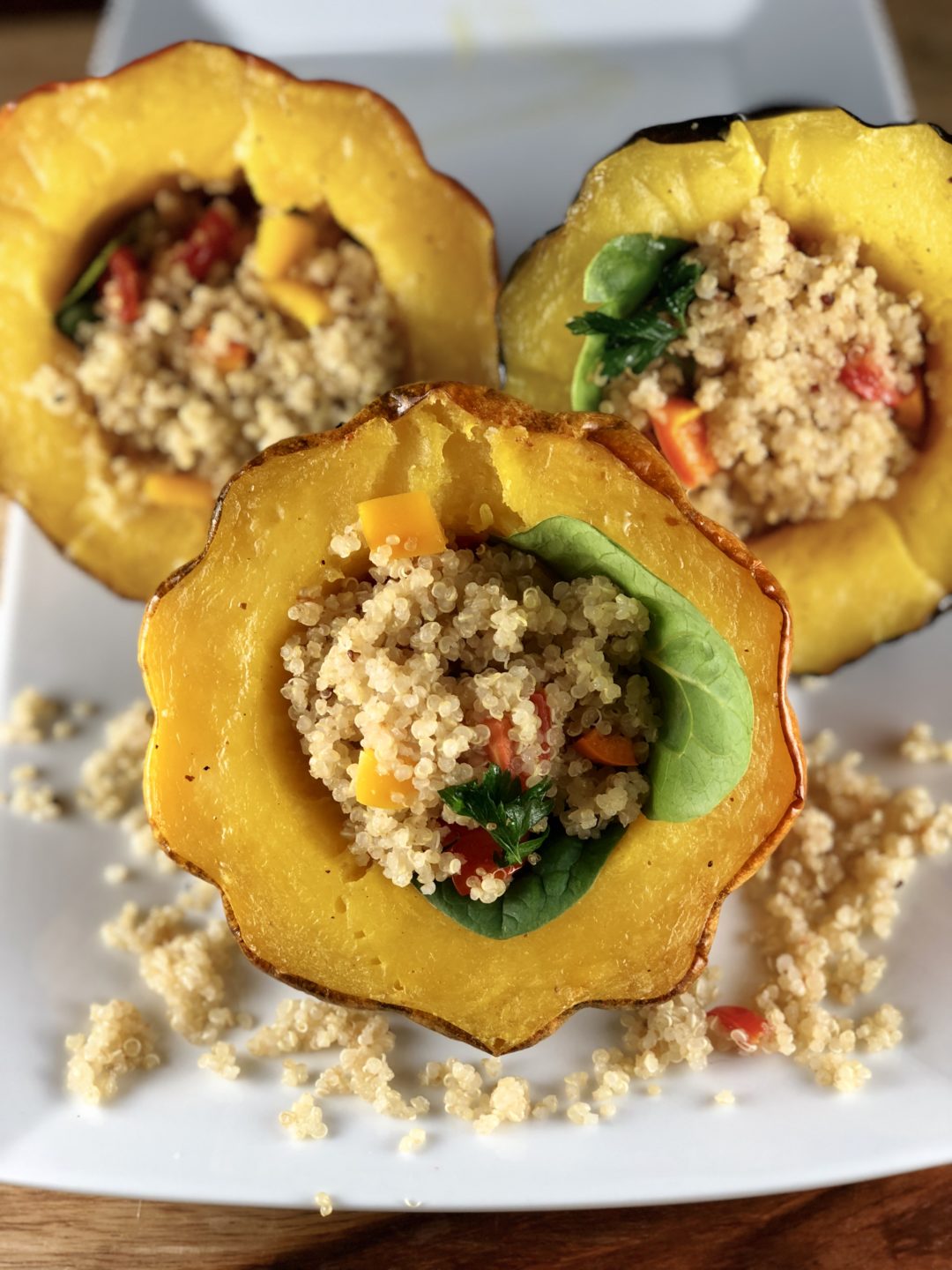 Do you ever make a dish that you know you just nailed even before trying the finished product? This would be that dish for me. I love creating recipes that are visually pleasing especially if it’s an ingredient like quinoa or acorn squash that not everyone is familiar with on a daily basis. Not only is this dish perfect for entertaining but it can easily go from a side dish into a main dish depending on the size of the acorn squash. Plus it doesn’t hurt to have low FODMAP food that everyone will enjoy! Feel free to add proteins like tofu, grilled shrimp, chicken or even ground meat to it. I made this for dinner one night when my mother in law, Rita, was over and she was blown away by how good it was. I know it she likes something I make, it’s REALLY good. She has even started incorporating it into her monthly poker group menu when she entertains. I hear all the time from her monthly poker group how much they love the dish. It tickles me something so easy can be such a hit. Isn’t that the best compliment you can get?