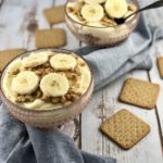 - Start the layering process either in dessert bowls or mason jars. Begin with a layer of graham cracker crumbs, bananas and pudding, repeat until the top of the glass.