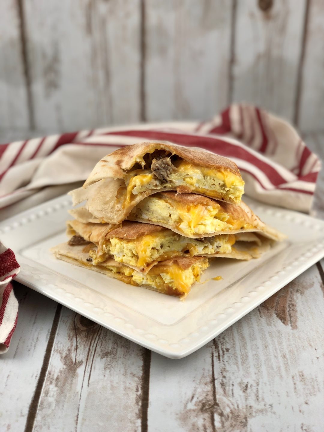 - Add one tortilla to the pan and add the scrambled eggs, cheese, breakfast sausage, salt & pepper. Place the second tortilla on top. Press the quesadilla down with a spatula. Cook for about 2-3 minutes on each side until lightly golden brown and cheese has melted.