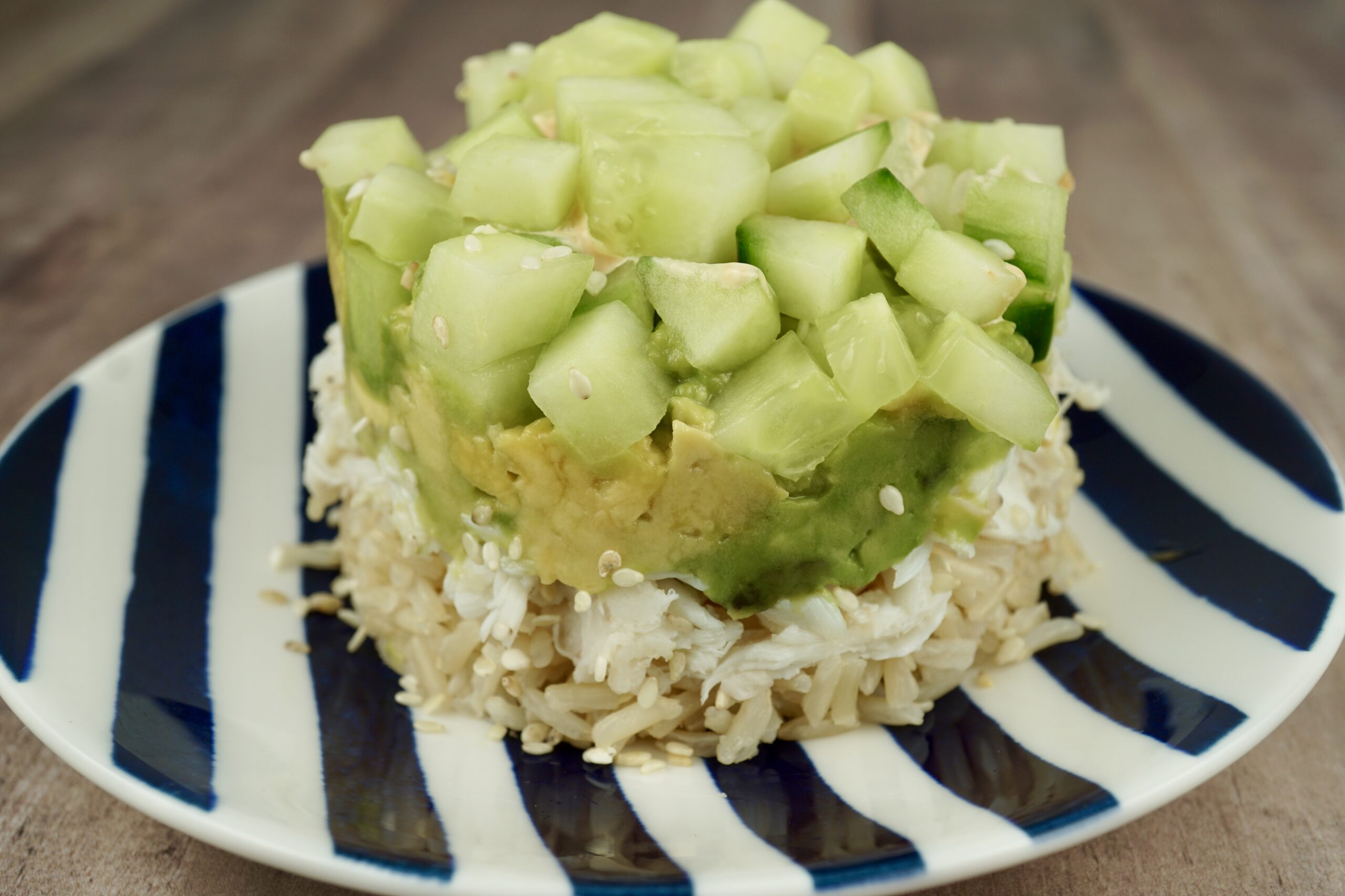 - Using a flat surface like a cutting board, start the layering process using either a circular tube (mine is from Sur la Tab) or 1 cup dry measuring cup. Begin with an even layer of cucumbers, followed by mashed avocado, crab meat and ending with about 1/3 cup rice (note: it helps to use a spoon to press the rice firmly down).