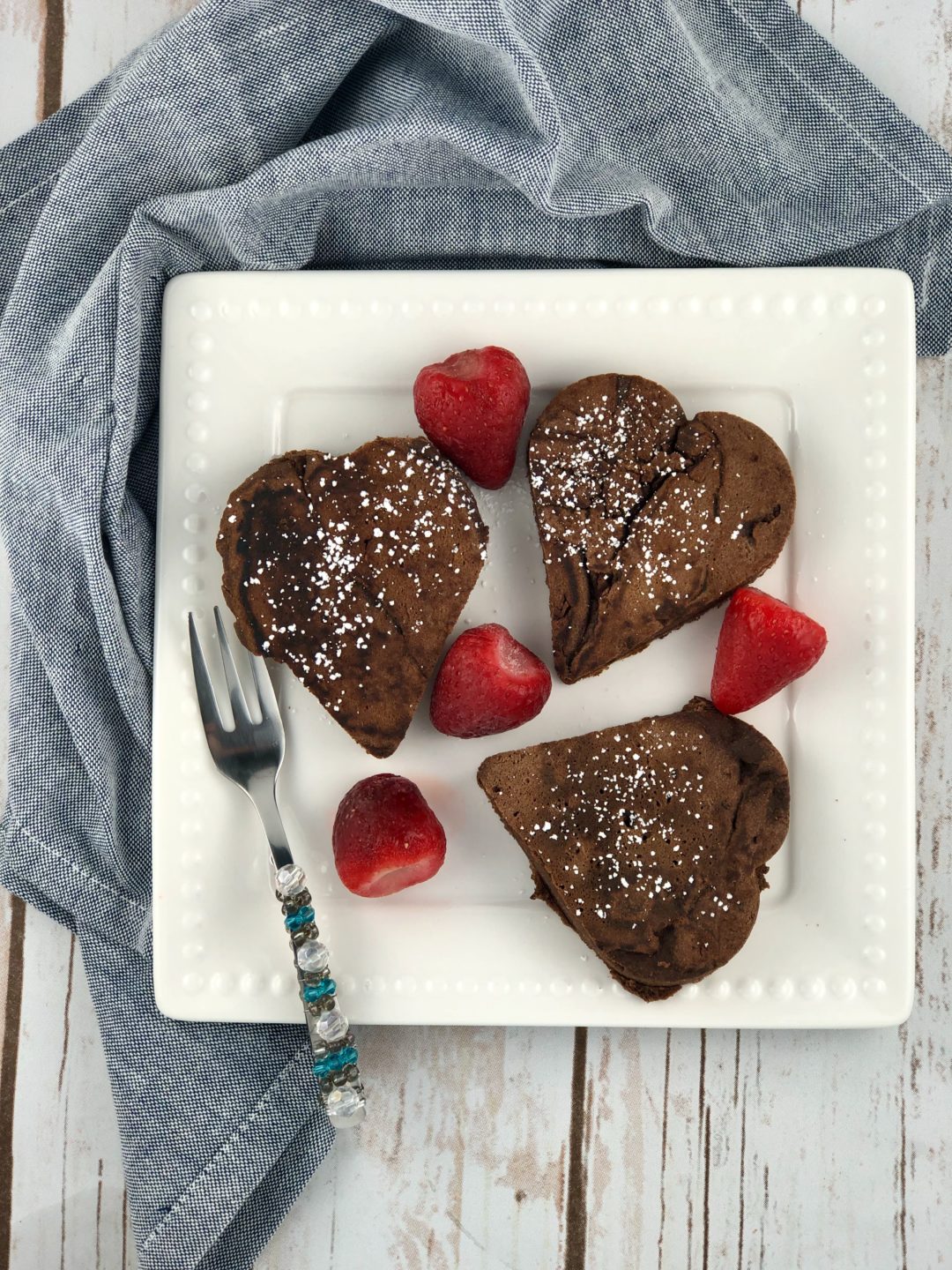 *I am the worst at flipping pancakes especially if there are shapes involved. My “cheat” method cuts the pancake into heart shapes after it’s cooked. No one will know and your hearts will be perfect!