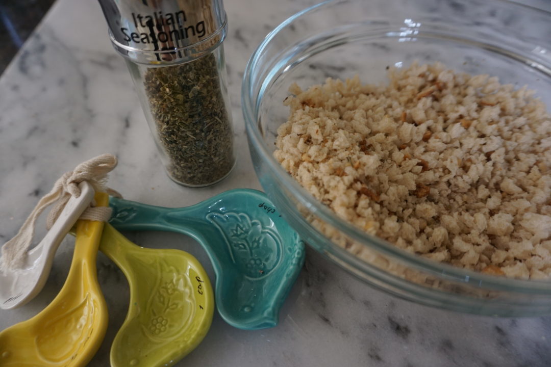 - Pour breadcrumbs into a large bowl and add a teaspoon of Italian seasoning if desired.