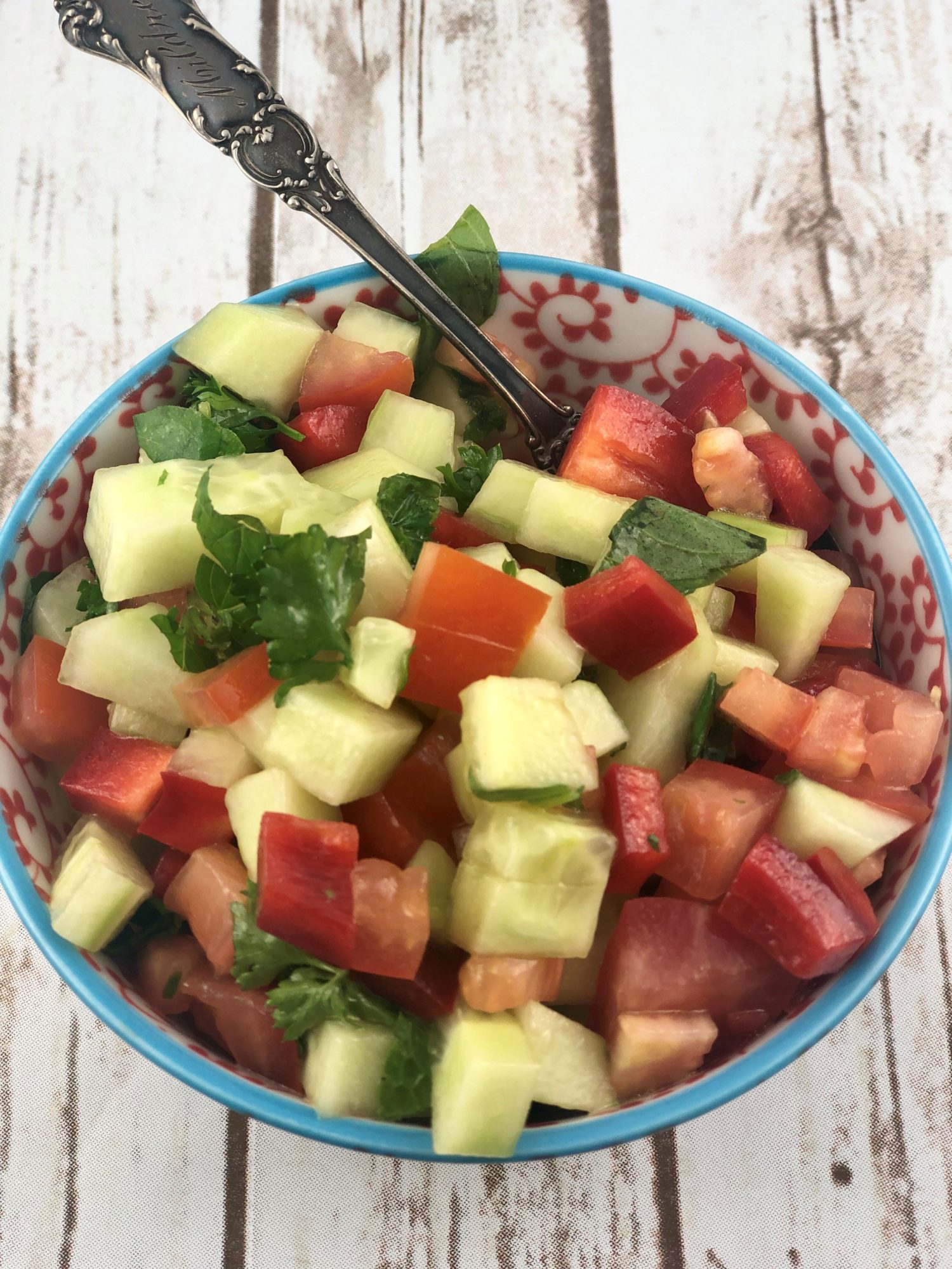 My brother and sister in law are currently in Israel and I am so jealous of all of the delicious foods they are eating. It’s bringing back all of these wonderful memories from my one and only trip to Israel. One of the most well-known national dishes is the Israeli salad which is composed of a finely chopped up salad of cucumbers, bell peppers, tomatoes, and raw onions. Obviously, the raw onion is a hard no for someone on the low FODMAP diet so I decided to make my own FODMAP salad version without the onions. I have to say, I think it’s much better and there is no gross raw onion breath to contend with. I have been known to pop a breath mint in someone’s mouth who just ate a mouthful of raw onion. I just can’t take it! #sorrynotsorry