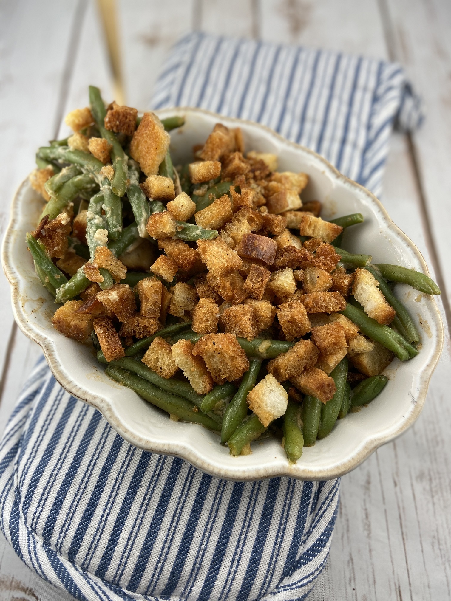I feel like I say this every single holiday season but seriously this time: WHERE DID THE TIME GO!!!?!?! I still haven’t come up for air from having my baby but when I think of what’s to come in the next few weeks, I need to get cooking! I have never ever been a fan of casseroles. There is something about having a ton of different ingredients thrown together that throws me off. Green bean casseroles are a staple on most holiday menus so I wanted to make a FODMAP safe side dish version that I would actually enjoy. This meant starting with fresh green beans instead of canned and also eliminating mushrooms as I’m not a big fan. I don’t know what it is but I cannot do canned green beans at any capacity! Instead of using the traditional crunchy onions, I swapped out with homemade croutons. I don’t want to brag but this FODMAP safe side dish is pretty dang good even for a casserole hater like me!