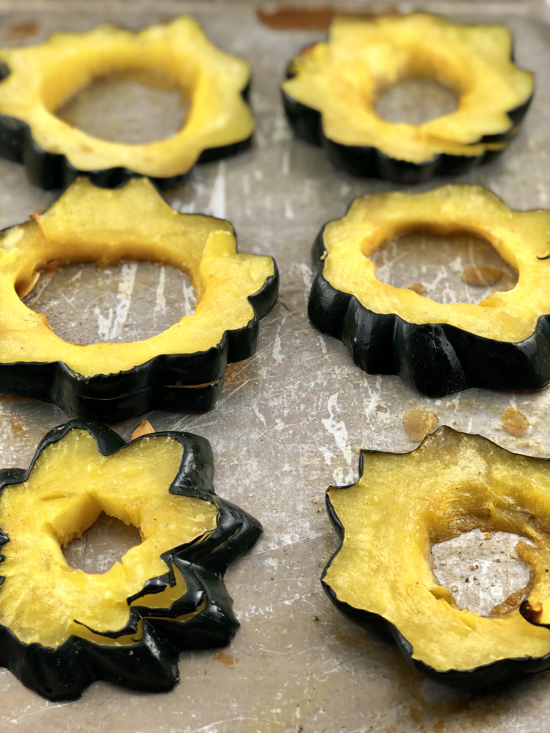 - Safely cut the acorn squash in half (removing the seeds in the middle) and cut into 1 inch thick rings.