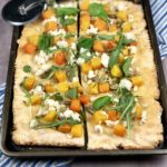 - Arrange cheese, butternut squash, & pumpkin seeds on pizza.