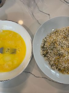 - Set up the dredging station: in a medium size bowl, whisk 2 eggs and set aside. In another bowl, add the bread crumbs, quinoa flakes, nutritional yeast, parsley, salt & pepper.