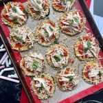 - Place on a parchment lined baking sheet and bake for 10 minutes. Flip over and bake for 7 more minutes. Top with tomato sauce, cheese and rotisserie chicken. Cook for an additional 4-5 minutes until cheese has melted.