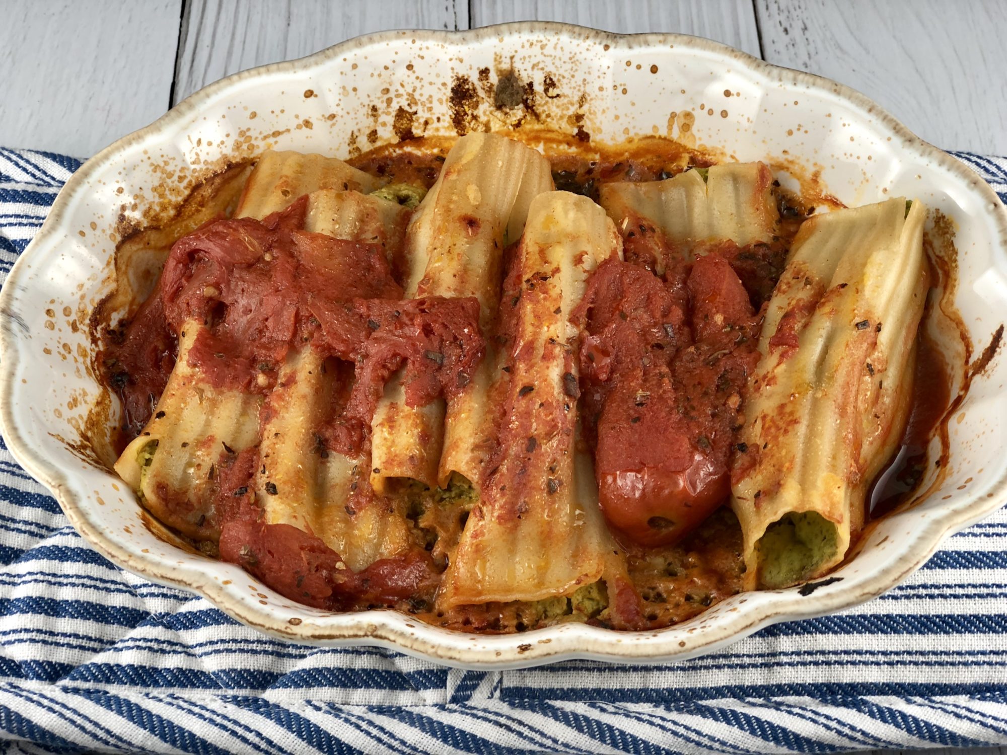 There are some nights that I want to eat something comforting and satisfying almost like being wrapped in a big fuzzy blanket. Do you feel me?? When these cravings hit, I know I need to make it myself as it’s close to impossible to find a comfort dish that is: dairy free, gluten free, onion free AND garlic free on a restaurant menu. Manicotti is one of those comfort dishes that I have been wanting to recreate for years. I knew I could make a FODMAP safe dinner version of this classic dish but it would take some creativity. My goal is to always sneak in a vegetable with anything I make. Spinach has always been my go-to as it’s so easy to add. I add it to just about anything I can think of: smoothies, milk shakes, homemade pesto, leftovers and now manicotti. Plus picky kids (or in this case my husband) will have no idea there is spinach in it.