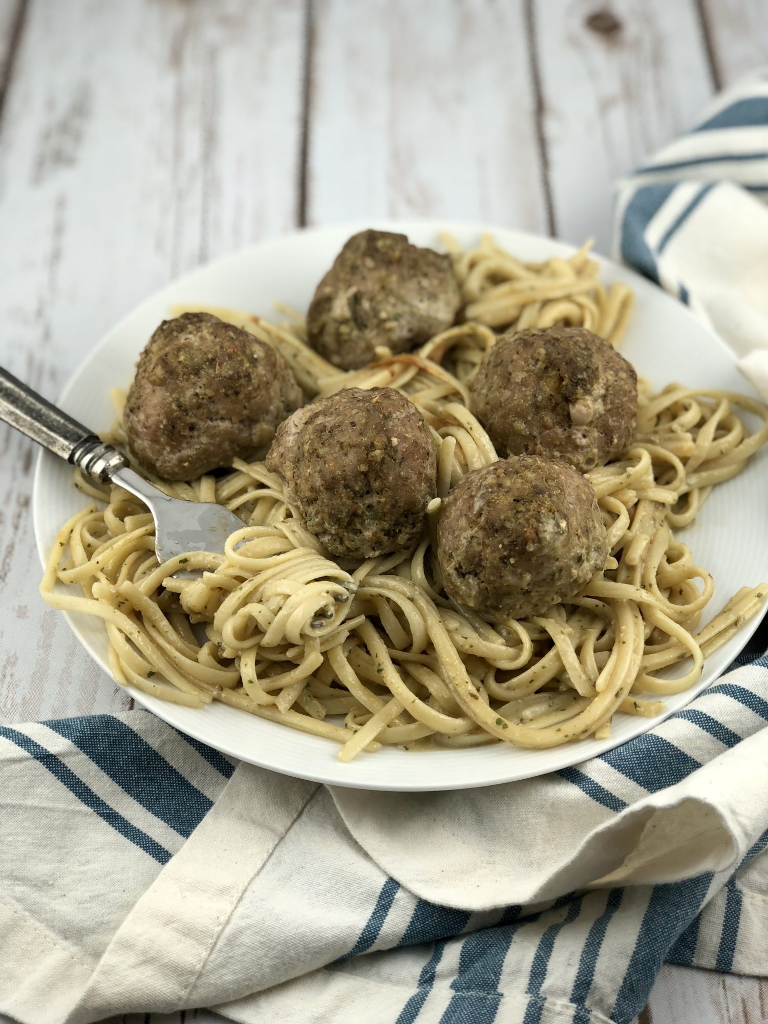 - In a large bowl Gently mix in all of the meatball ingredients (excluding the pasta of course) and form into roughly 1 inch round balls.