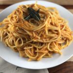 - Drain pasta and pour immediately into pasta sauce to combine. Top with fried sage leaves.