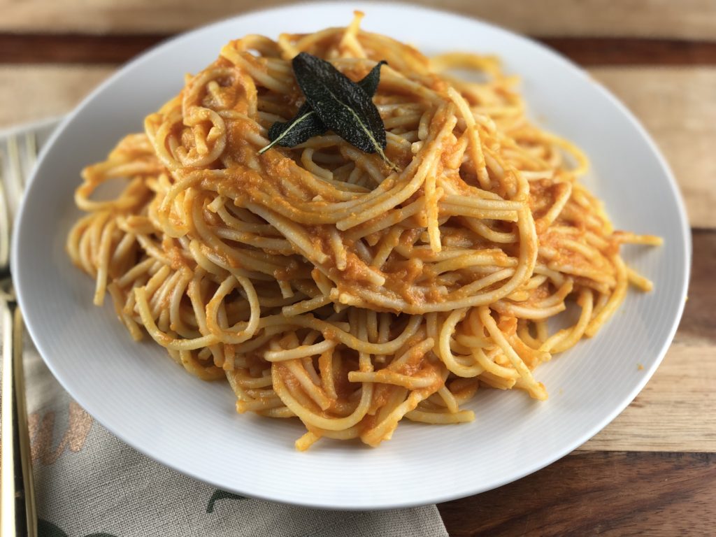 I have never been a fan of traditional white Alfredo sauce but it could also be because I only had the pre-made jar version as a kid. When the temperature changes so does my taste buds and I am all about comfort foods. With that being said, I wanted to try to incorporate all of my favorite fall foods (pumpkin anyone!?) and a lightened up take on Alfredo sauce. This quick and easy dinner comes together in under 20 minutes. This is a perfect fall meal to add to your IBS diet plans. The best surprise is how fulfilling this dish is without having dairy in the mix. Until recently I had no idea that was even possible and still be crave worthy.